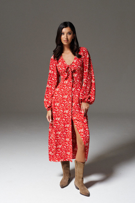 Платье полуприлегающего силуэта выполнено из красного полотна с цветочным принтом.Характеристики: полуприлегающий силуэт, отрезное, отрез по спинке на резинке, V образный вырез горловины, по низу горловины декоративные детали завязывающиеся на бант, застежка центральная на петли пуговички, пуговички декорированы тканью основного изделия, рукав втачной свободного кроя. Низ рукава на резинке. Длина по спинке 126 см, длина рукава 66 см.