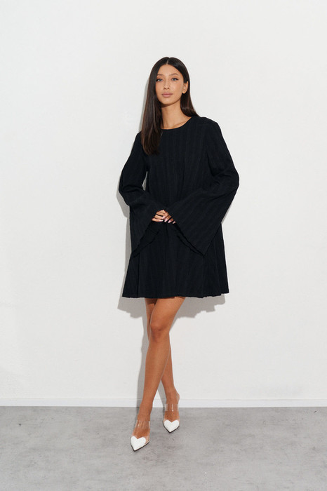 Платье свободного кроя выполнено из фактурного полотна черного цвета. Характеристики: А-образный силуэт, горловина овальная, застежка пуговичка петля по спинке изделия, рукав втачной с разведением к низу, низ изделия и низ рукава обработаны ролевым швом. Длина по спинке 84 см, длина рукава 69 см.