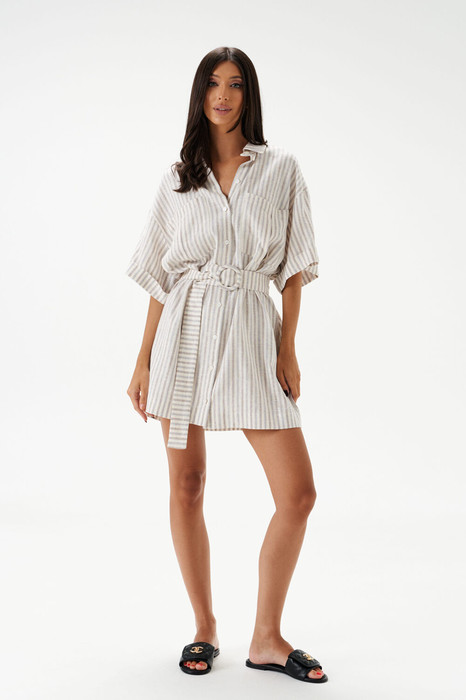 Платье прямого свободного кроя выполнено из льняного (смесового) полотна.Характеристики: прямой свободный крой, отложной воротник, застежка центральная на петли пуговицы, по линии талии нашиты шлевки, в комплекте пояс на кольцо из ткани основного изделия, по переду кармашек, рукав свободного кроя, по низу рукава подгиб.Длина изделия по спинке 83 см длина рукава от края горловины 42см.