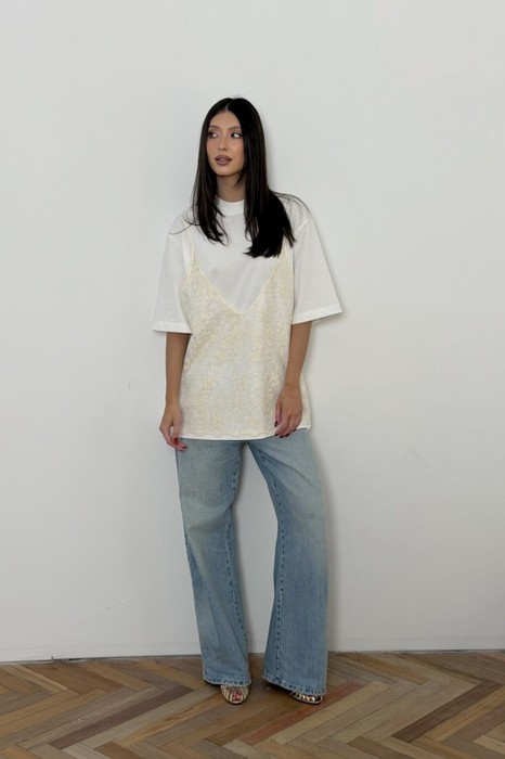 Комплект двух предметный, состоящий из джемпера и блузона. Характеристика: джемпер прямого силуэта. Выполнен из хлопкового полотна белого цвета. Вырез горловины круглый с притачной планкой. Рукав одношовный, втачной, короткий. Блузон прямого силуэта из кружева. Горловина V-образная по переду и спинке, на тонких регулируемых брителях. Длина джемпера по спинке 77 см, длина рукава от горловины 47 см. Длина блузона по спинке от плеча 74 см.