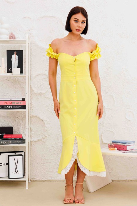 Платье в длие миди. застежка - пуговицы по центру переда.. силуэт приталенный. низ платья декорирован кружевом, срез закругленный. рукава оформлены в виде бретелей на резинке, надеть можно как на плечи, так и а предплечья.
