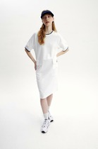 Платье в длине мини, выполнено из трикотажного полотна, который представляет собой ряд выпуклых вертикальных полос из «косичек». Верх платья обработан глубоким вырезом-лодочка и бретелями, имитирующими майку. Рукав расширяется к низу, по форме клеш. Платье хорошо тянется, идеально сядет н афигуру..