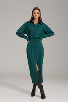 Женское платье полуприлегающего силуэта выполнено из однотонной гладкой плательно-костюмной ткани с отделкой из крепа с анималистическим принтом. Перед с нагрудной вытачкой справа и рельефом от плечевого шва до низа слева, заканчивается разрезом,в шов вставлена планка из декоративной ткани.Спинка со средним швом и талиевыми вытачками. Рукава втачные двухшовные,по низу на притачных манжетах из декоративной ткани.Платье укомплектовано поясом из отделочной ткани с одной стороны и основной ткани с другой,на концах декоративные зажимы.