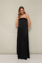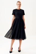 Женское платье выполнено из двух видов ткани, со сборкой и резинкой в области талии и длинной пышной юбкой.