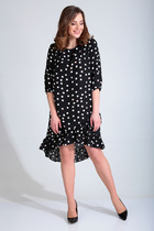 Платье женское, повседневное, полуприлегающего силуэта, отрезное по линии талии, длиной ниже линии колен, из хлопковой ткани. Перед с застежкой на пуговицы.  Вырез горловины обработан воротником на стойке. Рукав втачной, по низу обработан цельнокроенной манжетой. Длина по спинке 117 см, длина рукава 16,5 см.