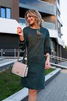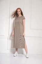 Платье женское полуприлегающего силуэта, выполнено из трикотажной ткани, с подрезом под линией груди и сборкой, с воротником, переходящим в капюшон на синке в контрастном цвете, рукав втачной 3/4, украшение в комплекте. Длина платья по спинке 104 см.