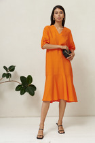 Платье прилегающего силуэта. Горловина круглая, по центру переда шов, по низу шва разрез, с левой стороны по линии талии декоративный элемент. Рукава втачные, фантазийной формы.