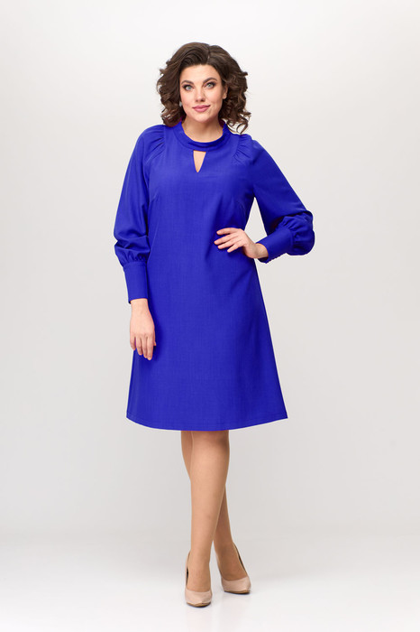 Элегантное женское платье из однотонной плательной ткани. Платье «А» образного силуэта с круглой горловиной оформленной стойкой, украшением служит съемный бант. Платье с фигурной проймой, рукав расширенный, со стойкой по окату и низу. Низ рукава оформлен широким манжетом с декоративными пуговицами. Платье без подкладки.