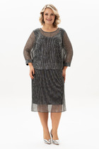 Платье А-силуэта, состоящее из 2-х слоев. Верхний слой: втачной длинный рукав со сборкой по окату и внизу на завязке, полочка и спинка с притачными слегка присборенным воланом с рюшей, воротник стойка-рюша и вырезом каплей по переду на завязке. Нижний слой: платье на бретелях с вытачками по переду на груди.