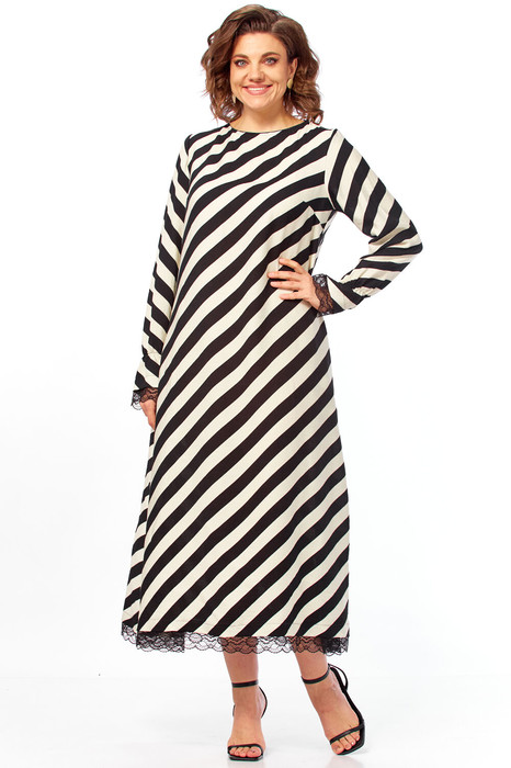 Модель представлена в свободном А-силуэте (трапеция), который обеспечивает комфортную посадку и свободу движений. Главным визуальным акцентом является контрастный принт в виде широких диагональных полос. Такое направление рисунка обладает выраженным оптическим эффектом: оно визуально вытягивает силуэт, придает динамику образу и делает фигуру стройнее.
