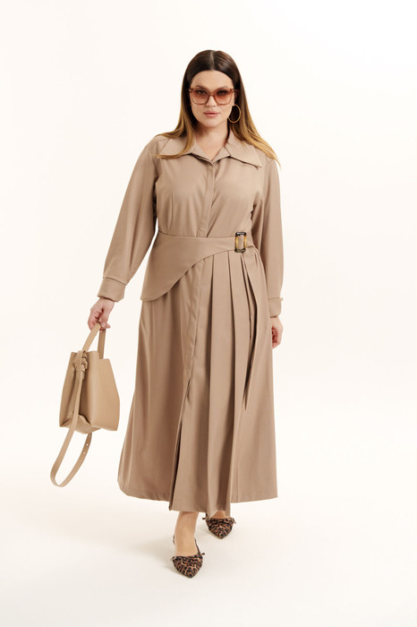 Платье женское приталенного силуэта из костюмной ткани. Вырез горловины оформлен воротником рубашечного типа. Застежка - потайная на петли с пуговицами. Рукава - втачные с мягкой складкой в области оката. Низа посажены на отрезные манжеты с застежкой на петли с пуговицами. Отрезное по линии талии. В боковых швах имеются карманы. Справа выполнен разрез, слева - складки. Изделие декорировано съемной баской.