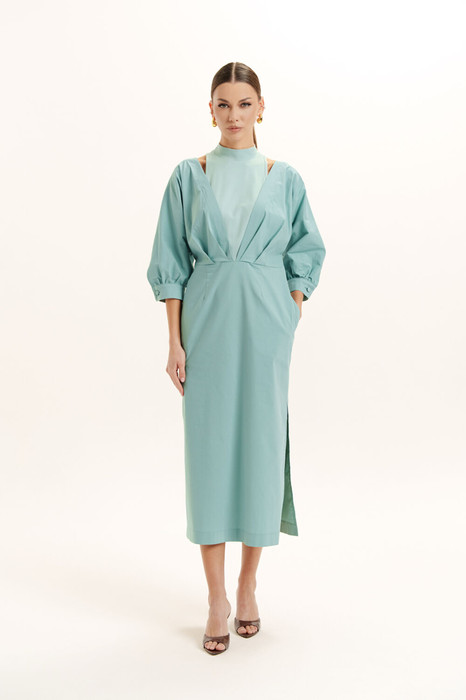 Красивое, стильное и элегантное  платье прямого силуэта  выполнено из хлопкового  полотна и элит трикотажа. Модель платья классика с рукавом 3/4 ЛЕТУЧАЯ МЫШЬ, низ рукава на манжете. Горловина оформлена воротником - стойка из отделочной ткани с застежкой по спинке на потайную молнию , что делает платье универсальным нарядом в гардеробе любой женщины или девушки. На платье обработан подрез со складками. По боковому шву разрез.
