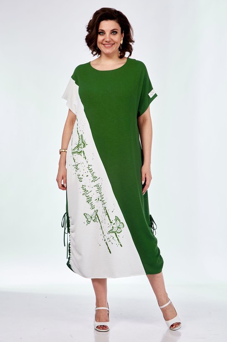 Платье женское свободного кроя расклешенное к низу. Спинка со средним швом. Перед с ассиметричным разрезом подиагонали. Правая часть переда из отделочной ткани с печатью в виде бабочек. Горловина округлой формы. По бокам внизу обработаны кулисы с завязками. Платье со спущенной линией плеча.