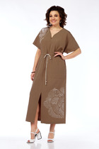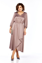 Платье женское длиной до середины икры, слегка расклешенное к низу. Спинка с косым передом в области талии и средним швом до разреза. Перед с косым подрезом в области талии, образующий мягкую складку из лифа и 1 глубокую складку от подреза вниз. Горловина с рубашечным воротником на стойке и драпировкой в виде качели. Рукав втачной с отложными манжетами.
