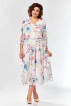 Платье женское длиной до середины икры, слегка расклешенное к низу. Спинка с косым передом в области талии и средним швом до разреза. Перед с косым подрезом в области талии, образующий мягкую складку  из лифа и 1 глубокую складку от подреза вниз. Горловина с рубашечным воротником на стойке и драпировкой в виде качели. Рукав втачной с отложными манжетами.