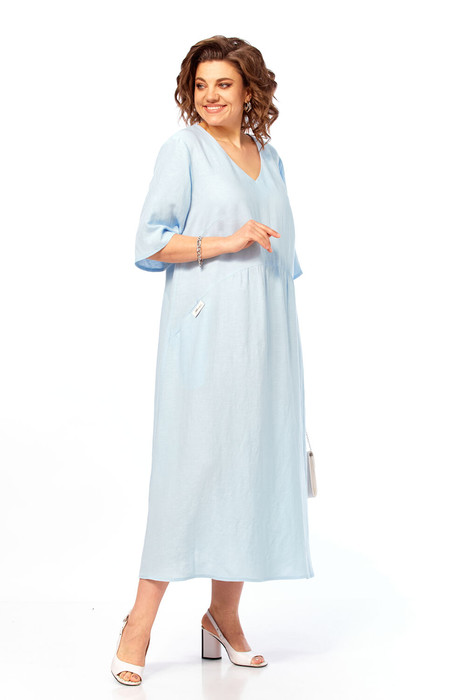 Платье женское свободного кроя . Спинка со средним швом и полукруглым подрезом в области талии. Перед с V-образной горловиной и полукруглым подрезом в области талии. В нижней части переда и спинки сборка в центральной части . Боковые карманы обработаны в шве подреза переда. Правый карман украшен нашивкой. Рукав втачной одношовный длиной до локтя. Фурнитура может отличаться от заявленной на фото.