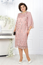 Платье женское полуприлегающего силуэта, двойное: костюмно-плательная ткань и сетка. Платье отрезное по линии талии с эластичной тесьмой в шве. По шву притачивания кокетки переда настрочена рюша. По кокетке спинки обработан разрез с навесной петлей и пуговицей. Рукава короткие, только в верхней части оката, нижняя часть оката обработана обтачками. Платье с отлетным поясом из бархатной тесьмы.