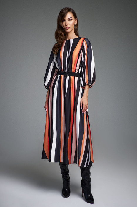 Платье женское приталенного силуэта, на подкладке. Рукав укороченный с резинкой по низу. Горловина круглая,на обтачке. В комплекте пояс-резинка на пряжке.