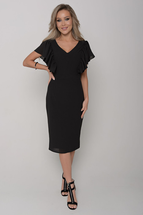 Платье прилегающего силуэта с воланами по лифу переда и спинки.