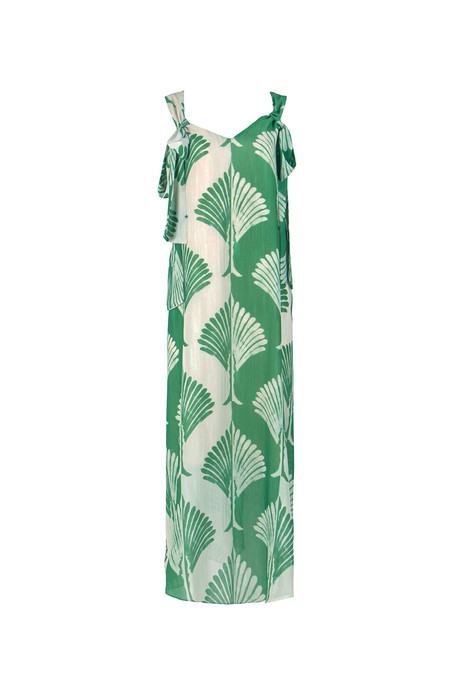 Платье женское, расширенное книзу, длиной макси, без рукавов. Горловина с V-образным вырезом по переду и спинке. Спинка со средним швом. На бретелях съемные банты.