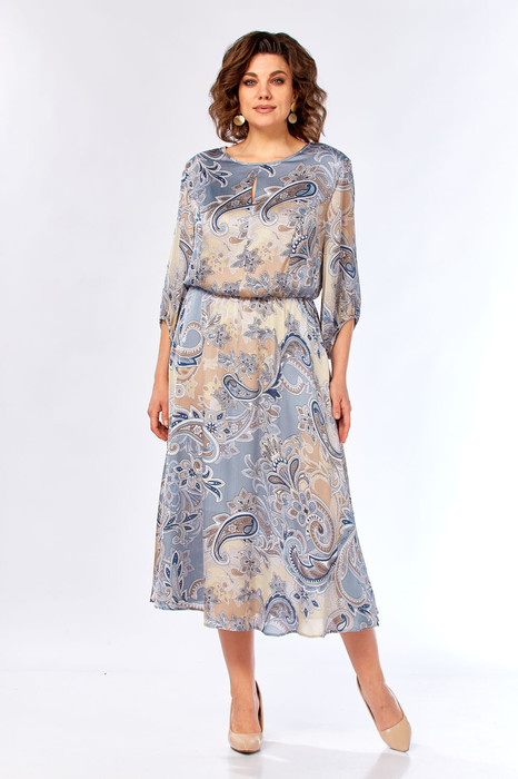 Нежное, изысканное платье, полуприлегающего силуэта расширенное к низу из струящейся ткани. Модель обеспечивает комфорт и свободу движений. Платье отрезное по линии талии, в подрез вставлена резинка, для комфортной посадки изделия. Горловина округлая, подчеркнута эстетичным вырезом по лифу. Рукав втачной, эффектная форма придает легкость стилю. Застежка на навесную петлю-пуговицу. Низ платья на подкладке.