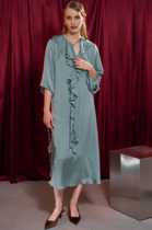 Женственное платье приталенного силуэта выполнено из креп-шифона. Округлая горловина на внутренней обтачке. Длинный втачной рукав присобран на эластичную резинку. Модель отрезная по линии талии, присобрана на резинку. Юбка на подкладке. Низ ровный, без разрезов.