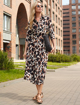 Платье выполнено из атласа с геометрическим принтом. Платье прямого силуэта длиной миди. Спереди средний шов с разрезом. Спинка цельная. Горловина V-образной формы. Рукав цельнокроеный, покроя "кимоно", двухшовный, длиной ниже линии локтя. Платье на отлетной по низу подкладке. В комплект входит ремень из эко-замши.