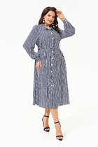 Платье выполнено из плотного джинса. Платье А-образного силуэта, длиной миди. Застежка спереди на металлические пробивные пуговицы. На спинке кокетка и встречная складка от нее. Воротник стояче-отложной с отрезной стойкой. Рукав втачной, одношовный, с прорезью и складками по низу. Низ рукава на манжете, застегивающейся на пуговицу. В боковых швах карманы. Платье декорировано нашивками из натуральной кожи по переду и спинке. В комплект входит ремень из сновной ткани с обтяжной пряжкой.