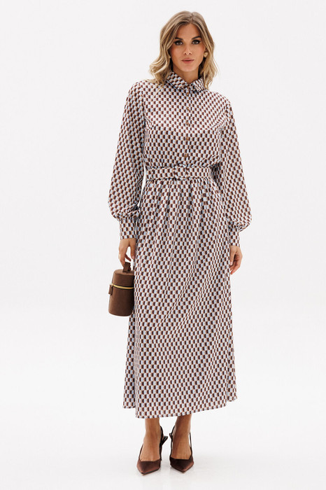 Платье выполнено из тонкого атласа с принтом. Платье отрезное по линии талии. Воротник рубашечного типа. Застежка спереди на пуговицы на планке. Рукав втачной, на манжете. Лиф и юбка платья на подкладке из тонкого однотонного атласа.  В комплект входит съемный ремень из основной ткани с обтяжной пряжкой.