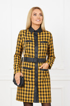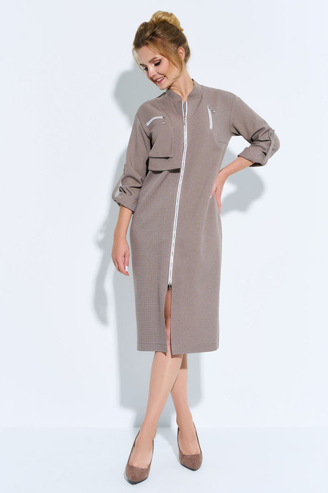 Платье женское приталенного кроя выполнено из тканей-компаньонов.  По полочке платья расположена декоративная кокетка с молнией. Застежка разъемная молния по переду. Рукав-втачной длинный с патой. Горловина-стойка.