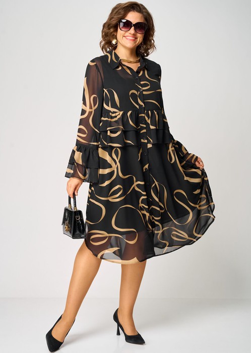 Платье женское нарядное свободного силуэта на подкладке, выполнено из шифона с принтом. Застежка доверху на петли и пуговицы, воротник на стойке рубашечного типа, рукав втачной с приточными воланами со сборкой. По спинке двойная кокетка и встречная складка по центру. Низ фигурный, в боковых швах обработаны небольшие разрезы.