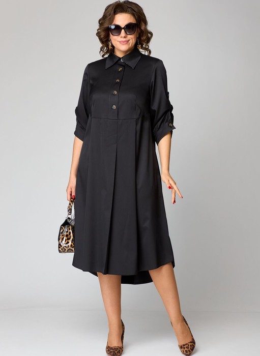 Платье женское повседневное полуприлегающего силуэта с фигурным низом расширенное к низу, выполнено из плательной ткани в сочетании с отделкой с принтом леопард. Вырез горловины воротник «стойка», рукав втачной 7/8 по низу на притачной манжете собран на сборку. В рукаве отделочная пата которой можно регулировать длину рукава и делать короче. В боковых швах обработаны карманы и разрезы . По переду застежка до талии на обметанные петли и три отделочных пуговицы, по спинке фигурная кокетка и встречная складка. Платье расширено к низу за счет складок по переду. Декором служит отделочнй принт в манжетах и стойке воротника.