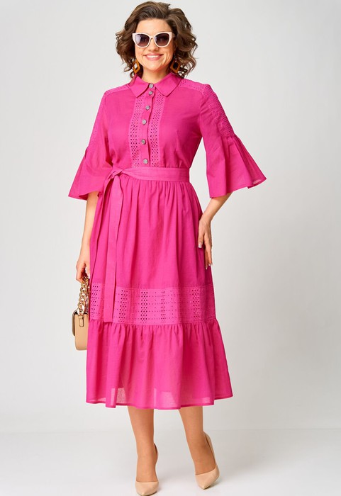 Платье женское нарядно-повседневное полуприлегающего силуэта до талии расширенное к низу. Выполнено из хлопка в сочетании с отделкой из хлопокового шитья. Вырез горловины воротик на стойке рубашечного типа, рукав втачной с отделочными вставками из шитья. расширенный к низу за счет встречных складок. По талии и по нижнему волану юбки сборка и отделочная вставка из шитья. По верхней части спинки фигурная кокетка из шитья. Застежка до талии на обметанные петли и пуговицы. Декором платья служит съемнй пояс из основной ткани.