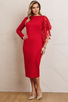 Платье шикарное женское нарядное вечернее полуприлегающего силуэта расширенное к низу, выполнено из плательного крепа в сочетании с сеткой с принтом в виде паутинки. Вырез горловины круглый на обтаке, по пинке застежка на навесную петлю и пговицу. Рукав втачной из сетки по низ собрн на резинку. Платье с фигурным подрезом по полочке, по низу притачной волан из сетки. Декором служит красивая нарядная отделочная ткань на рукавах и волане.
