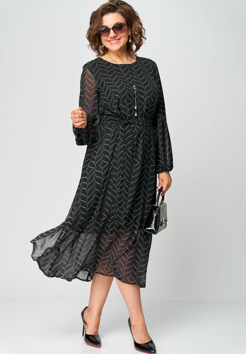 Платье женское нарядно-повседневное А-образного силуэта, выполненео из креп-шифона. Платье на трикотажной подкладке. Вырез горловины круглый на обтаке, по спинке астежка на навесную петлю и пуговицу. Рукав втачной по низу собран на резинку. В бокох швах обработаны разрезы, низ платья фигурый.Декором платья служит принт самой ткани. Пояс в комплекте.