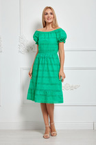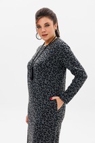Платье женское нарядно-повседневное полуприлегающего силуэта до талии расширенное к низу. Плье отрезное по талии. Выполнено из креп-шифона. Вырез горловины отложной воротник с подбортами, до талии застежка на обметанные петли и пуговицы. Рукав втачной по низу собран на резинку. от талии юбка платья на трикотажной подкладке. Декором платья служит съемный пояс и принт самой ткани.