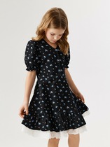 Платье из однородной кулирки. Линия талии завышена, юбка на сборке. По горловине оборка, на спинке застежка на одну пуговицу. Спереди платье украшено накатом.
