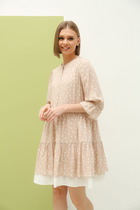 Свободный А-силуэт с цельнокроенным рукавом, ассиметричные линии членения отрезной нижней части платья с коническими вставками и эффектным разрезом. Оригинальный вырез горловины с завязкой-бантом на спинке.