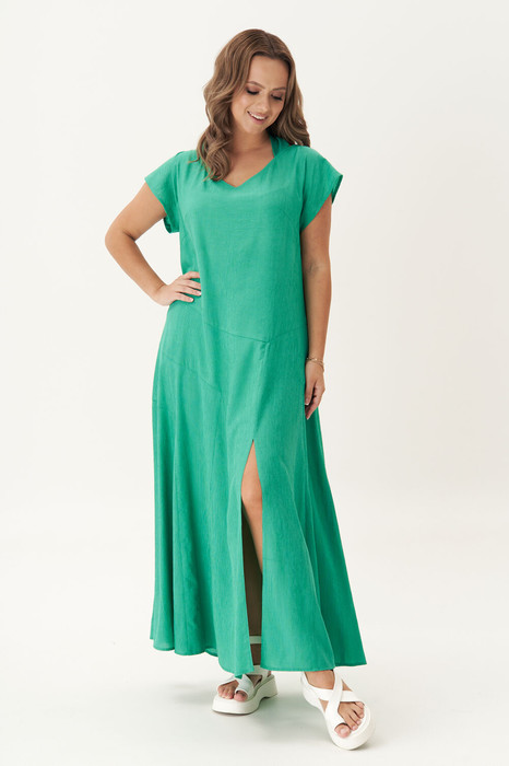 Свободный А-силуэт с цельнокроенным рукавом, ассиметричные линии членения отрезной нижней части платья с коническими вставками и эффектным разрезом. Оригинальный вырез горловины с завязкой-бантом на спинке.