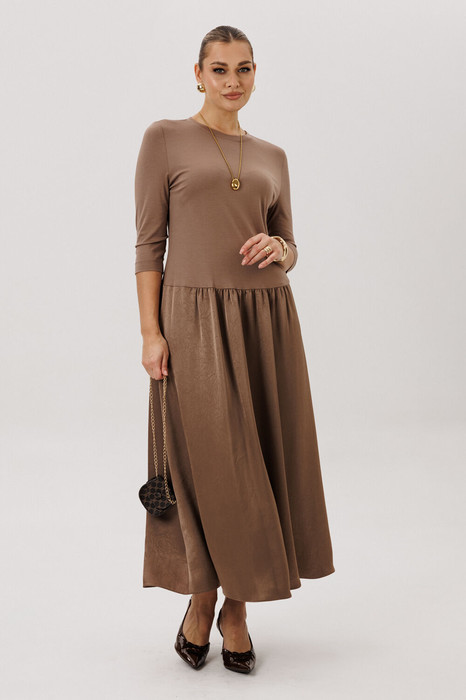 Свободный силуэт, втачной покрой, круглая горловина с эффектной каплей на спине. Верх платья - из мягкого трикотажа, низ - из невероятного вискозного крэшевого полотна.