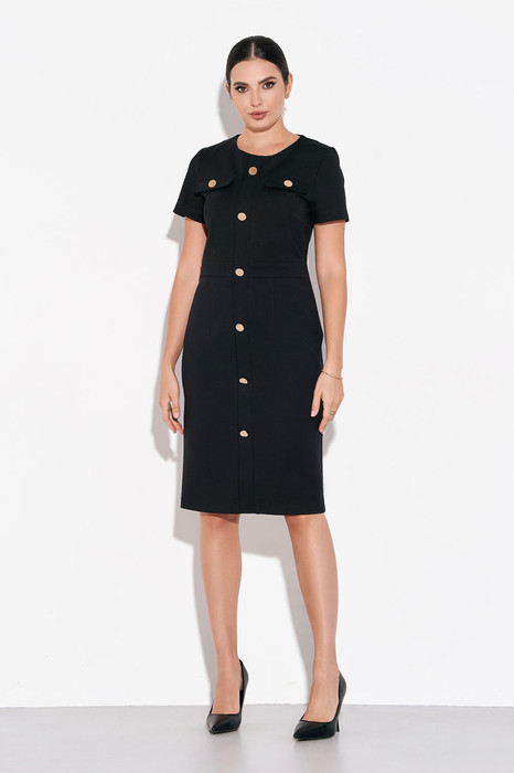 Женское классическое платье прилегающего силуэта длиной до середины колена выполнено из высококачественного мягкого трикотажа. По переду платья нефункциональная планка с пришивными декоративными пуговицами, по спинке сверху - застежка на молнию, снизу - шлица. При правильном уходе ткань не скатывается и не деформируется. Уход: - стирка при температуре не более 30 градусов, предпочтительно ручная или деликатный режим стиральной машины;