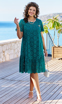 Платье женское прямого силуэта, длиной до середины колена. Рукав рубашечного покроя, длинный. Линия плеча немного спущена. Платье выполнено из трикотажного мягкого полотна, с хорошей растяжимостью.Членения спинки и переда ассиметричные. Горловины круглая, обработана узкой бейкой. В нижней части переда слева расположено пришивное украшение— апликация.