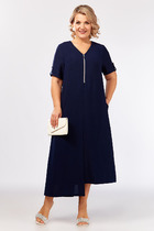 Платье женское полуприлегающего силуэта из тонкого джинса, длиной до середины колена. Свойства ткани позволяют расположить на изделии детали чётких форм: паты(по плечевому шву), декоратные клапаны(на нижней части переда), а также расположить втачную декоративную молнию в верхней части переда. Рукав платья короткий втачной, по центру переда-потайная застежка на петли и пуговицы, горловина оформлена воротником-стойкой, борт образует отложные лацканы. Клапаны и паты украшены металлическими пуговицами. Платье дополняют съёмный пояс и декоративные строчки