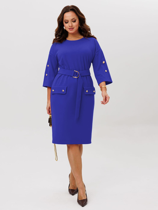 Нарядное платье из трикотажного крепа с мелким блеском станет прекрасным выбором для вечерних мероприятий,корпоративных встреч и праздничных торжеств.Особенностью этого стильного платья является его прямая модель ,которая подчеркивает женстсвенность и элегантность.Платье подходит для полных женщин. Платье прямого силуэта с нагрудными вытачками.Рукав спущенный с декоративной шлицей и пуговицами. Декором платья являются клапаны  и пуговицы.Пояс эффектно подчеркивает талию.