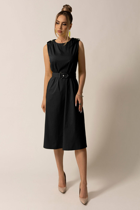 Платье без воротника, без рукавов, с круглым вырезом горловины,с застежкой на потайную молнию в среднем шве спинки. По плечевым швам- сборка и паты, зафиксированные к плечевым швам. Перед цельный, спинка со средним швом. Платье со съемным поясом.
