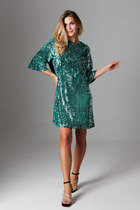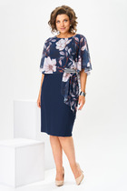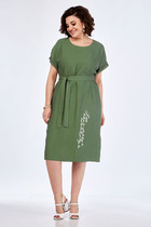 Платье c отложным воротником и лацканами, втачным широким поясом, застежкой на потайную молнию в левом боковом шве. Верхняя часть платья с кокеткой переда и спинки. Верхняя часть переда с имитацией застежки, односторонними складками по шву притачивания кокетки и пояса, верхняя часть спинки с односторонними складками по шву притачивания пояса. На втачном поясе расположены шлевки для двух съемных поясов. Нижняя часть переда и спинки с четырьмя односторонними складками по шву притачивания пояса. Платье без рукавов , со спущенным плечом. На кокетке платья расположена декоративная пата, закрепленная по плечу тремя пуговицами. Платье со съемными поясами.