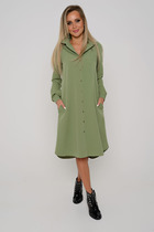 Платье расширенного к низу силуэта, без воротника, без рукавов, с круглым вырезом горловины. Горловина и проймы окантованы. По переду с отрезной кокеткой. Нижняя часть переда по шву притачивания к кокетке присборена. Спинка с отрезной кокеткой фигурной формы. Нижняя часть спинки по шву притачивания к кокетке присборена.