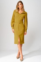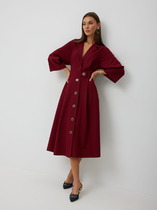 Платье, с центральной двубортной застежкой на пришивные кнопки, с отложным воротником и лацканами. Верхняя часть переда с нагрудными вытачками. Верхняя часть спинки со средним швом и талиевыми вытачками .Нижняя часть переда и спинки расклешенная. Низ переда закладывается в односторонние складки. Шов по талии присборен на резинку. Рукав втачной, короткий, с отложной манжетой. Платье со съемным поясом.