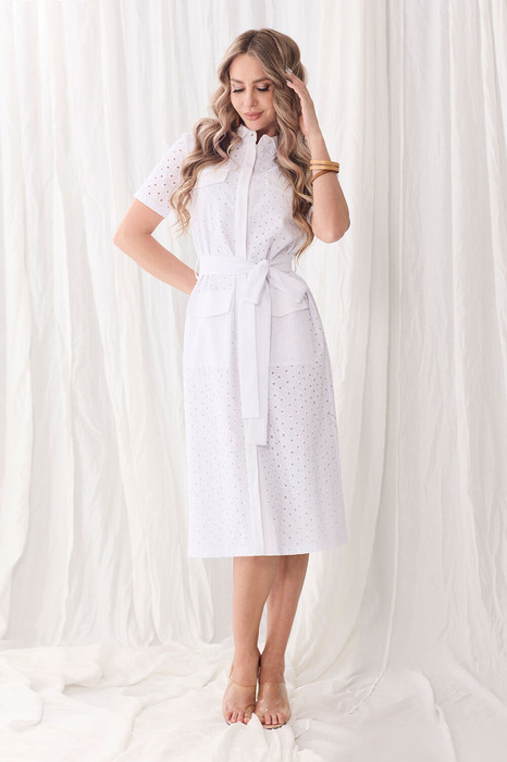 Платье с центральной потайной застежкой на петли и пуговицы, с втачным воротником с отрезной стойкой. По полочкам на уровне линии груди расположены клапаны, на уровне линии бедер- накладные карманы с клапанами. Рукав втачной, короткий. Платье со съемным поясом. По боковым швам расположены шлевки для пояса.