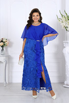 Платье с центральной застежкой на петли и пуговицы, отрезным воротиком- стойкой Застежка расположена на отрезной планке с втачными рюшами вдоль всей планки. Полочки и спинка с двумя рядами воланов по низу. Рукав втачной, 3/4, с отрезной манжетой. Окат и низ рукава со сборкой. Платье со съемным поясом- шнуром.